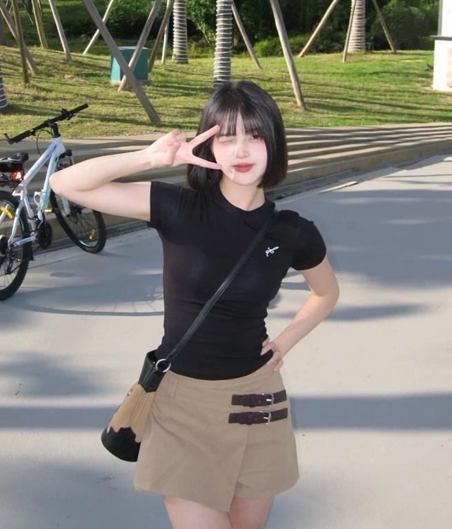 短髮的女生,一定要試試甜酷風,因爲這種風格是最容易打造出甜酷風穿搭的了,黑色短袖t恤+卡其色半身短裙,很修身顯瘦的一套,也非常適合小個子女生。