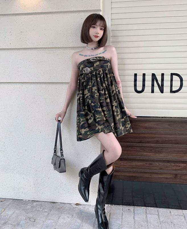 身材好的姐妹,到了夏天就不要把自己的好身材藏着掖着了,給自己選擇一件漂亮的裙子穿出門吧。抹胸裙,迷彩的顏色真的很顯白,還帶給人一種不羈的少女感,搭配空氣劉海短髮,就是甜辣妹一枚了。