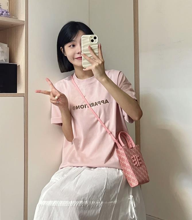 元氣感十足的一套,淺粉色短袖t恤,在這樣一個色調的襯托下,感覺膚色都變白皙了許多。選擇白色半身長裙相配,粉色+白色,也太顯甜美和減齡了吧,少女風滿滿。