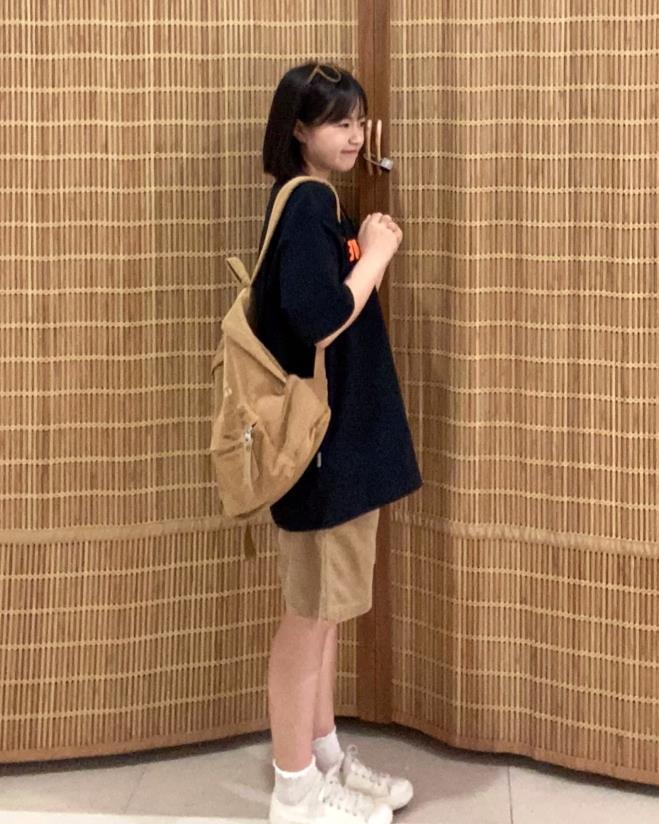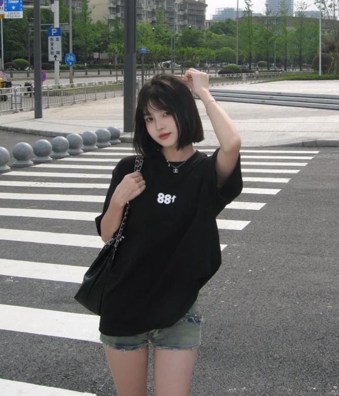 短髮看起來就很乖,有木有?黑色寬鬆的短袖t恤,這個顏色看起來就酷酷的,很喜歡啊,最重要的是這個顏色上身後十分顯瘦,寬鬆的版型,更是恰到好處遮掩住身上的贅肉。搭配起一條牛仔短褲就能愉快度過夏天了。
