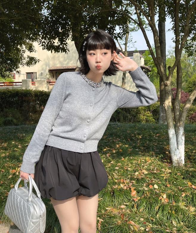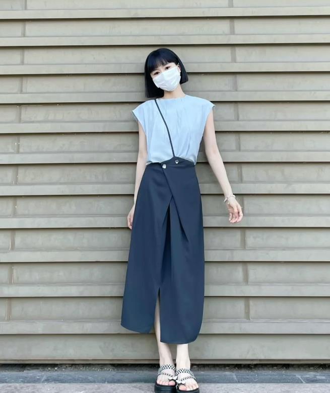誰懂啊,這一套看起來也太氣質了吧?淺藍+灰色,當這兩種顏色組合在一起,就是很時髦和高級。況且,在淺淺的藍色調襯托下,膚色看起來就很白皙,與開叉半身裙相配,腿部線條不經意間被拉長了。