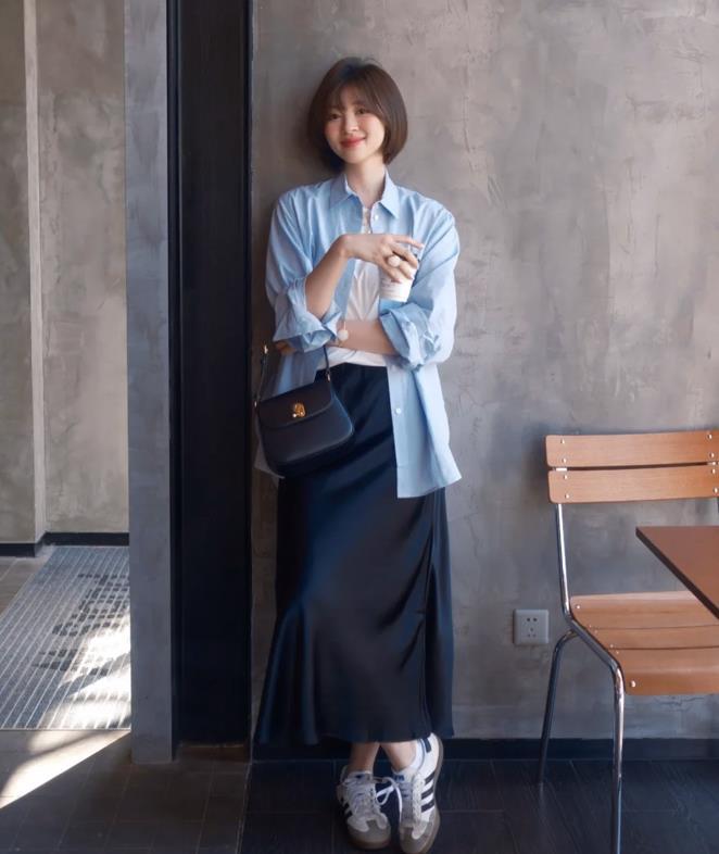適合春夏的look,藍色襯衫+白t恤,這樣的疊穿,比起單穿一件襯衫要時髦很多,下裝配的是一條黑色緞面半身裙,瞬間又多了幾分優雅和氣質。藍色和黑色白色的配色看起來很乾淨,也溫柔。