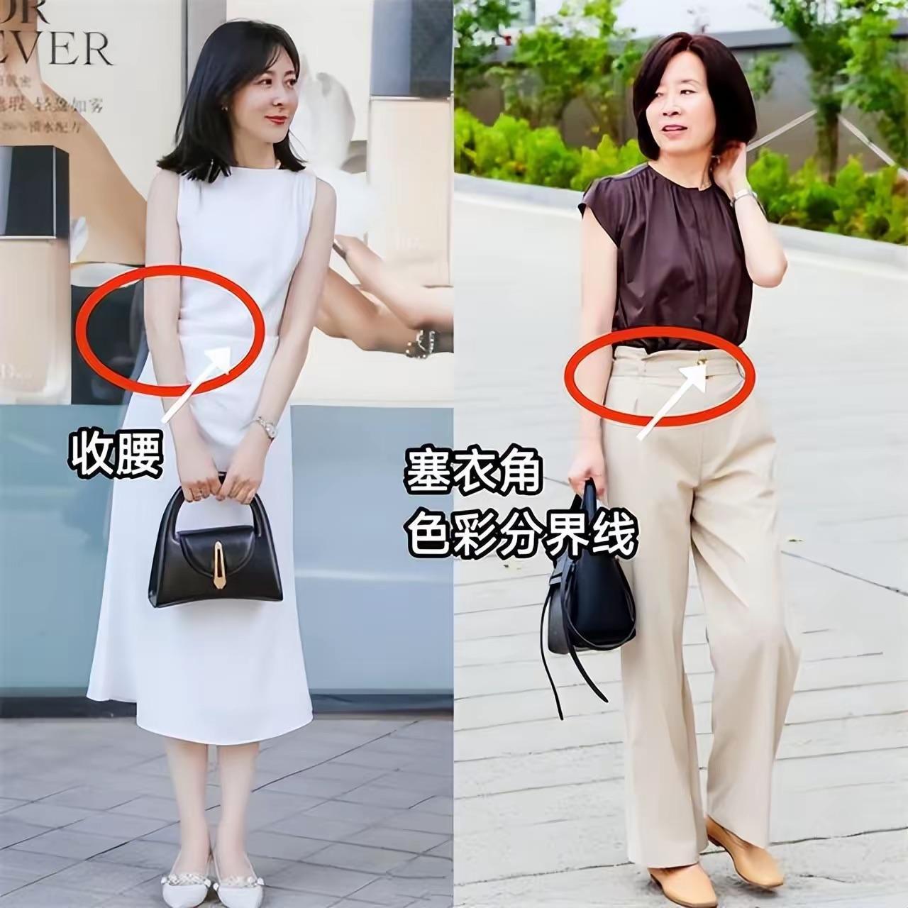 1、利用收腰/或者塞衣角/色彩分割等方式,塑造高腰線