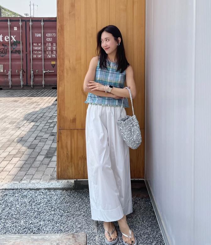 一整個被清爽住了,很適合夏天的穿搭,無論是度假、逛街還是約會啥的都可以,格紋背心搭配白色闊腿褲,真的超級減齡清爽的,對不對?寬鬆的褲子版型,穿起來也太顯瘦了,很藏肉,不要覺得白色就顯胖,完全沒有的事。