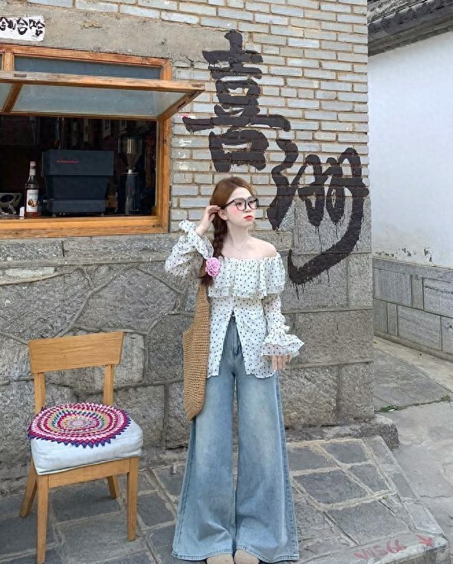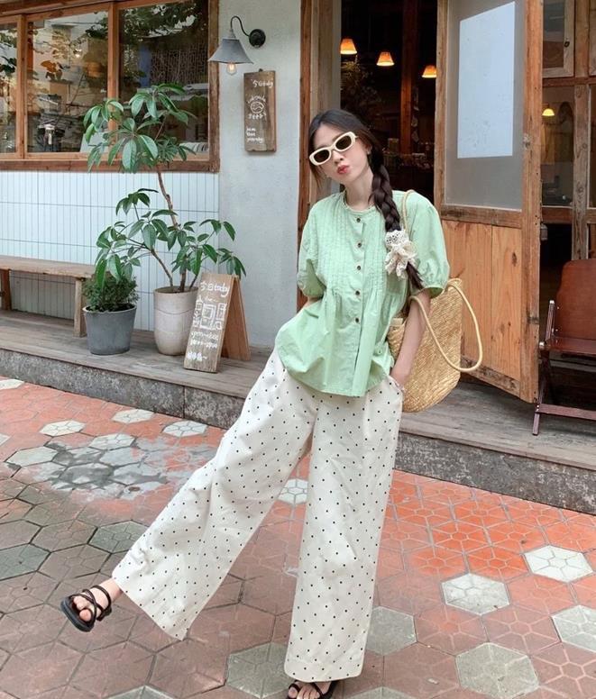 誰懂啊,薄荷綠配波點褲,看起來真的好韓好小清新啊,這一套看起來也太好看了,一眼就愛上,小清新的綠色襯衫+波點闊腿褲,有種韓系小清新範的既視感。