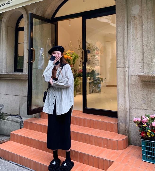 微胖女生,在夏天一定要試試這一套,顏色比較素雅的條紋襯衫,寬鬆的版型加持下,穿起來也太舒適自在了休閒了吧?袖子和領子處的拼接,也是非常特別的,搭配黑色半身裙,看起來就充滿韓範。