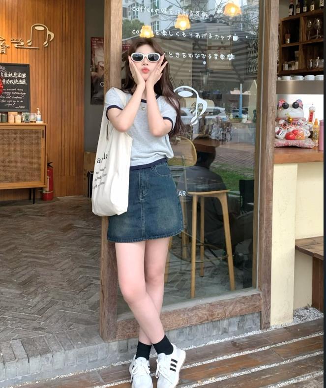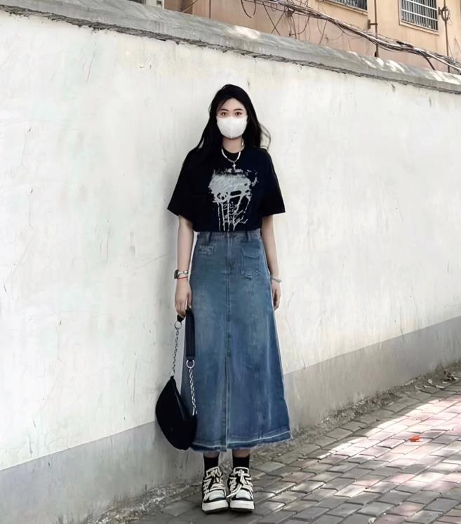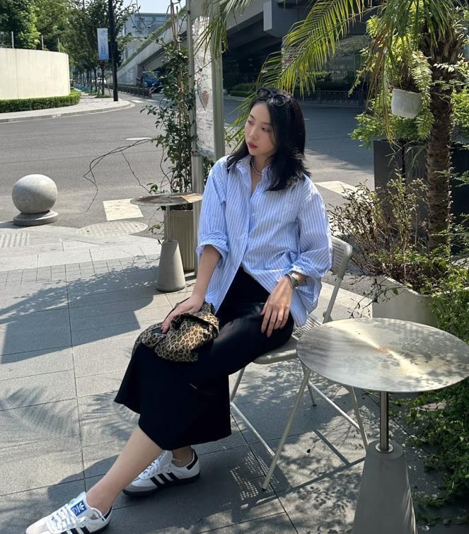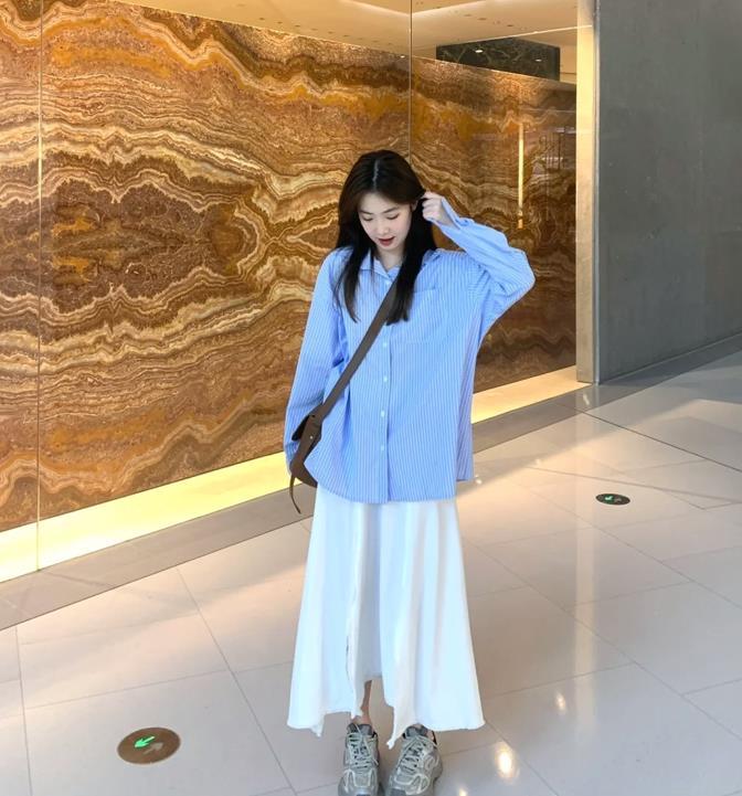 適合通勤上班,也適合日常休閒逛街,這一套襯衫與半身裙的搭配,值得大家學習起來,藍色襯衫搭配白色半身長裙,加上一雙運動鞋後,整個造型就顯得很休閒又耐看了。
