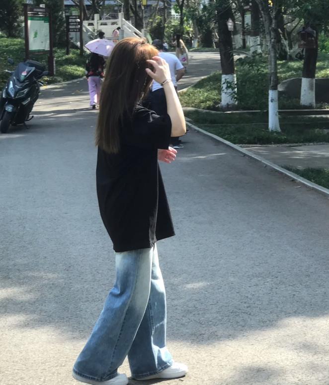黑色t恤配牛仔闊腿褲,這也太好看了吧?寬鬆版型的t恤,對於微胖身材的女生來說就是很友好的,再加上經典黑色,視覺上具有很好的瘦身效果。和同樣寬鬆的牛仔闊腿褲組合一起,一整套給人的感覺就是很慵懶隨性。