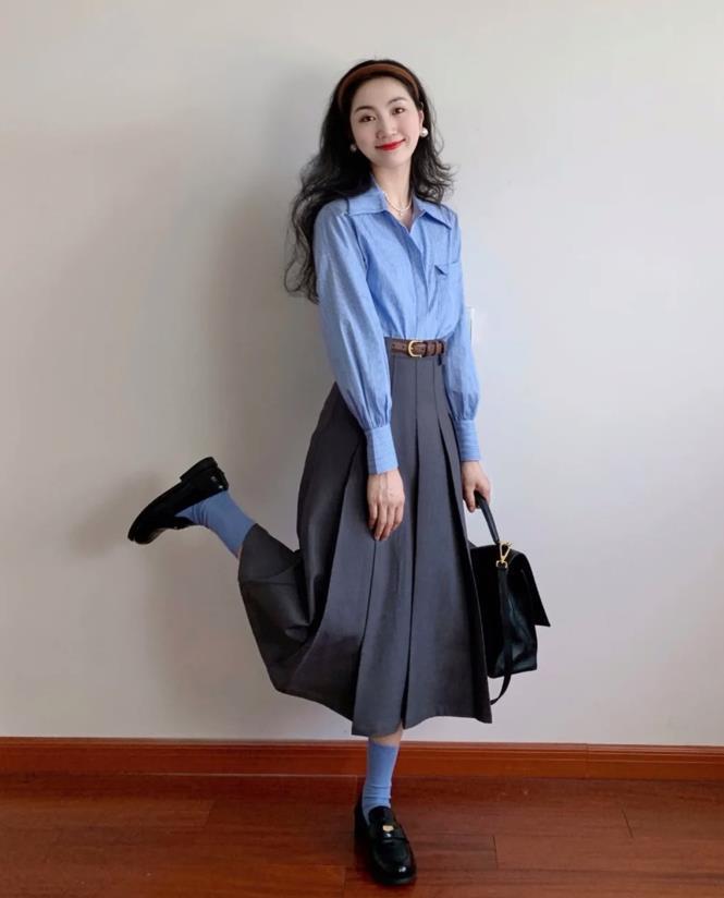 藍色條紋襯衫+灰色百褶半裙,簡單自在又不失氣質感,這種大皺褶設計的裙子,對於下身胖的身材也是非常友好的,加上提高腰線之後,不僅修飾了腰身比例,還延長了腿部的線條。