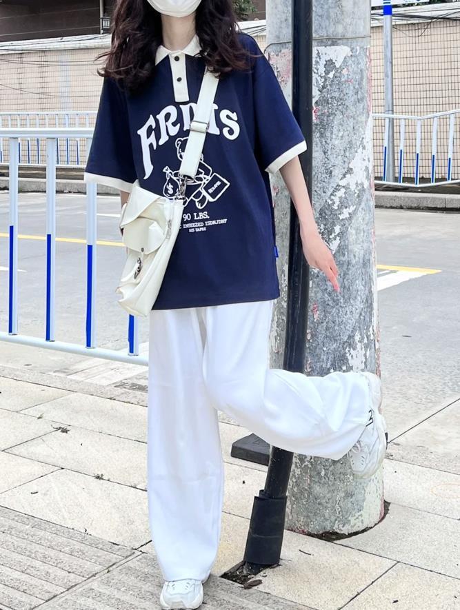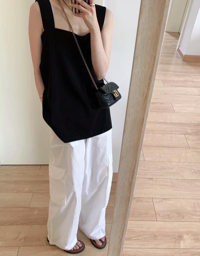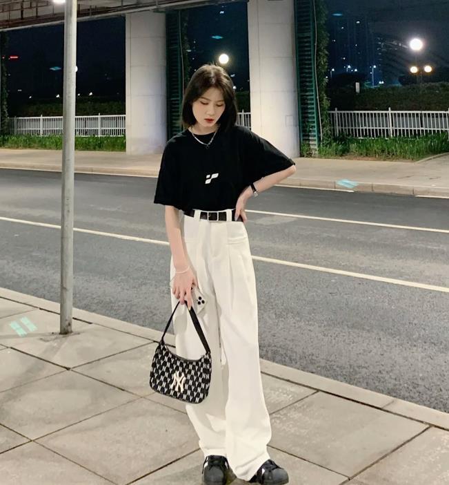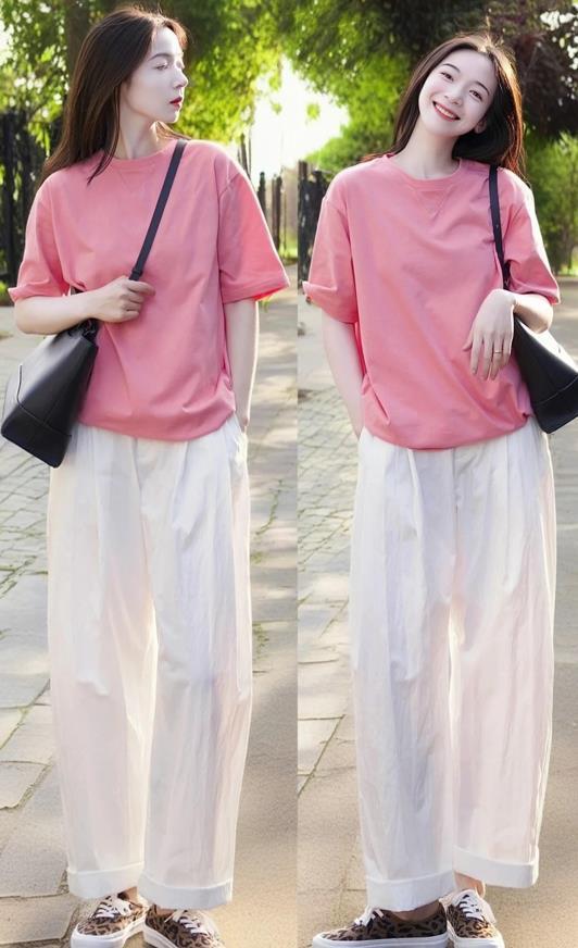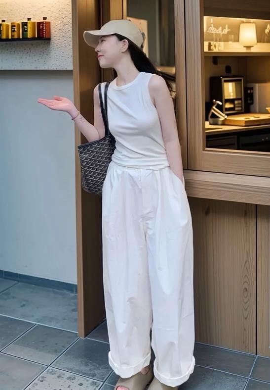 白褲子+小白鞋,褲子與鞋子顏色一致,在視覺上下身的比例線條就會被拉長了許多,而且這樣的配色會讓你整個造型看起來更和諧協調,也很簡約時尚。這樣的搭配不僅看起來舒適還百搭,無論是日常休閒逛街,還是度假出遊都可以輕鬆hold住。