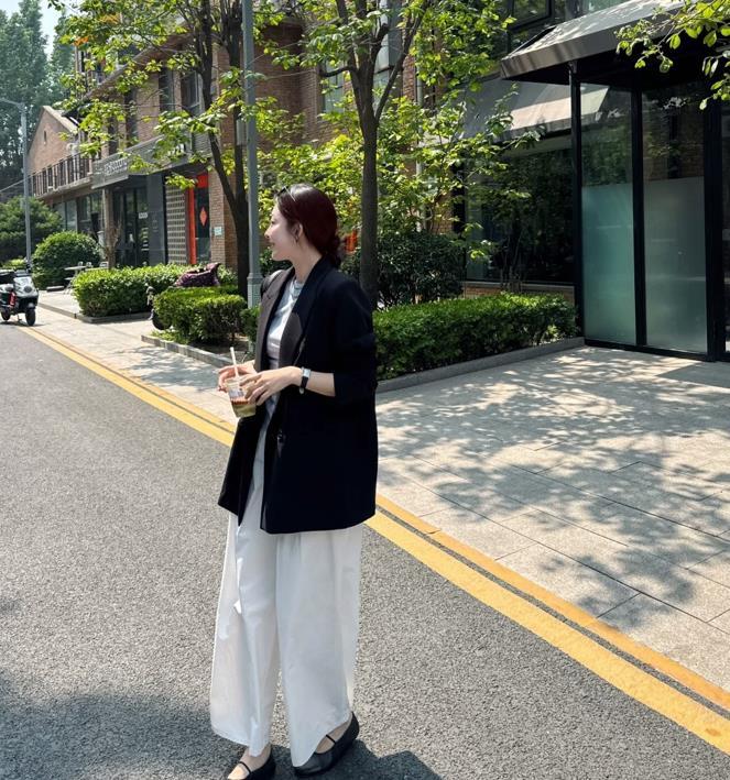 在職場上班的女性,一定要爲自己入手一條西裝褲,覺得九分西裝褲穿起來過於嚴謹和正式的話,那麼就爲自己入手一條休閒款的西裝褲,配以乾淨的白色,真的超級適合在夏天穿的,與黑色西裝外套結合,有種很簡約的高級感。