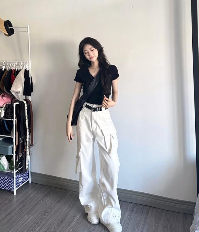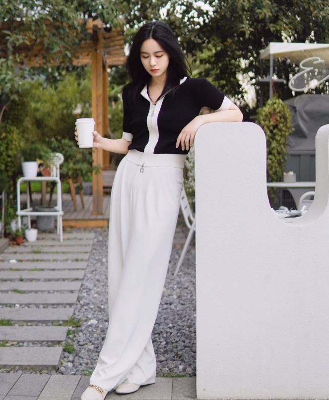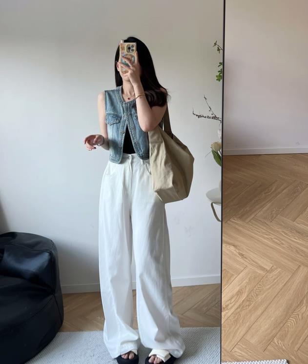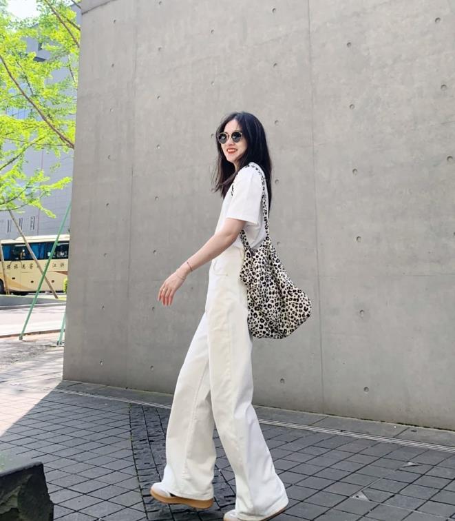 白褲子,可是永不過時的褲裝,它經典百搭且簡約,如果你擔心穿白褲子會顯胖的話,那麼就給自己入手一條寬鬆的闊腿白褲子吧,在這樣的版型加持下,完全不用擔心會顯胖的。牛仔的質感也非常好,垂墜感也相當不錯,穿起來顯瘦還顯腿長。
