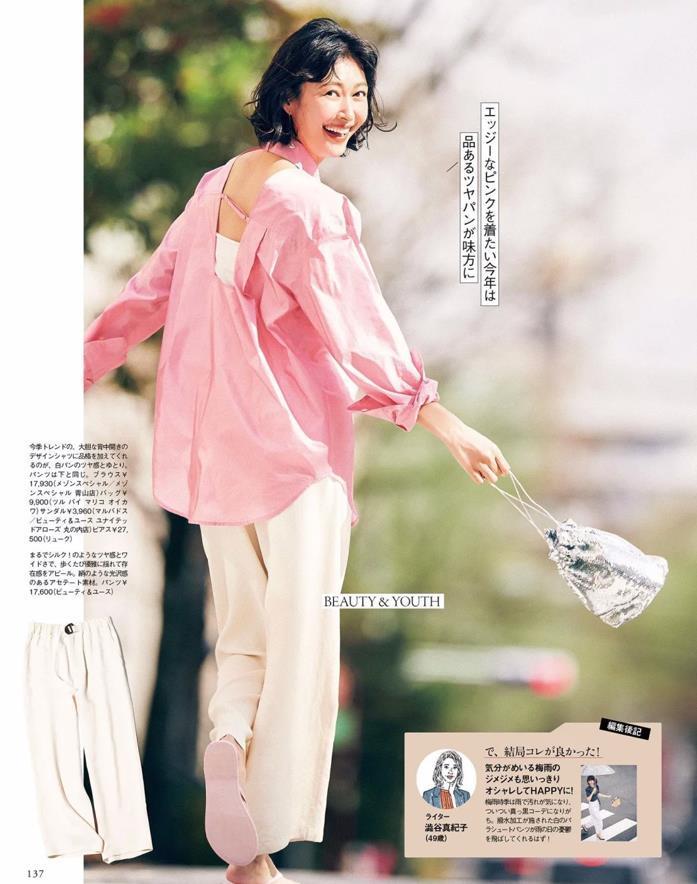 搭配上白色褲子,一整個顯得很溫柔甜美,最重要的是這樣的穿搭配色還很減齡,適合約會逛街等場合。