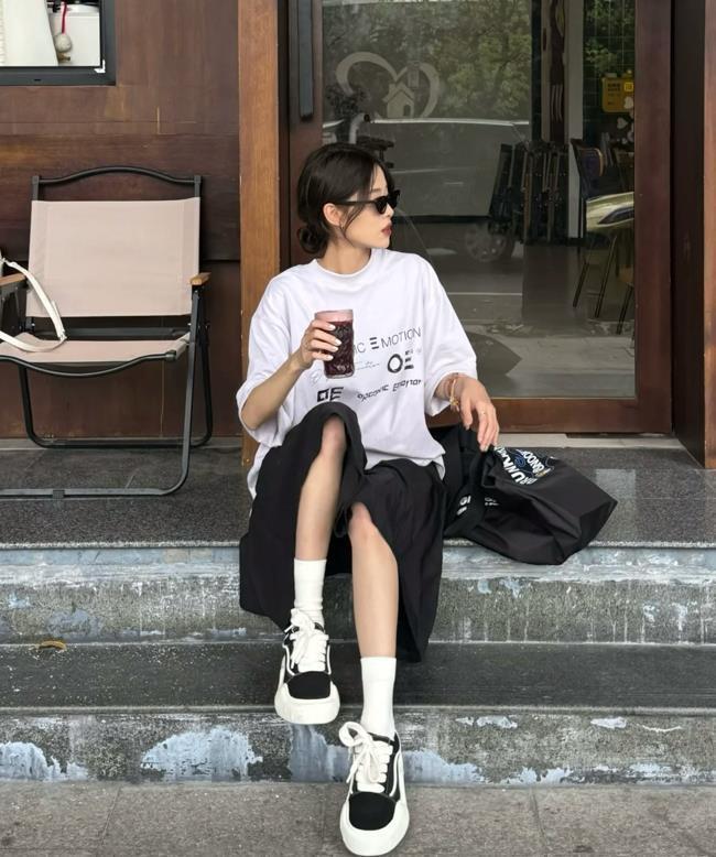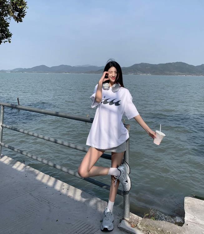 T恤搭配運動鞋的穿搭,一整個都是韓範十足,很喜歡啊這樣的搭配,感覺就非常適合大夏天的,白色的t恤,版型是偏寬鬆的,有種大一號的既視感,下身配條短褲、短裙就可以的,玩轉下身失蹤法妥妥的。