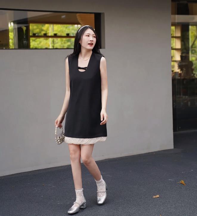 這纔是精緻女孩的最佳約會look,黑色a字版型連衣裙,領口的蝴蝶結和裙襬處的設計都蠻有小心機的。搭配銀色瑪麗珍單鞋,走起路來很輕便舒適自在,逛街約會和日常都是妥妥的。