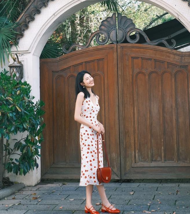 法式風滿滿的一條小碎花連衣裙,看起來真的非常溫柔啊,上面的碎花都是紅色的,和乾淨的白色很般配,腳下踩着的紅色瑪麗珍單鞋與包包、裙子都進行了呼應,和諧度十足。