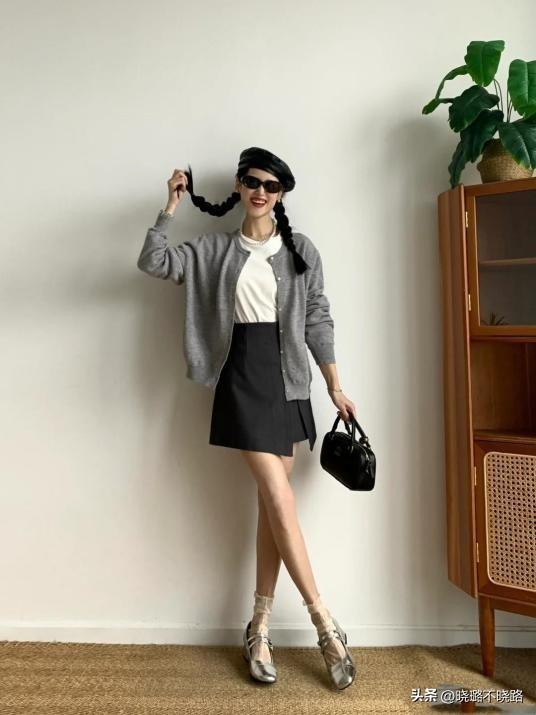 選擇基礎色系互相組合,即使充分運用混搭技巧,也不容易出錯。白色的T恤和灰色的奶奶衫搭配在一起,休閒中帶着一絲溫柔。再搭配黑色的短裙,可以盡情的展現女性的自信與魅力。腳上的銀色瑪麗珍鞋彰顯了時尚與個性的氣息,表達了自己的審美眼光。