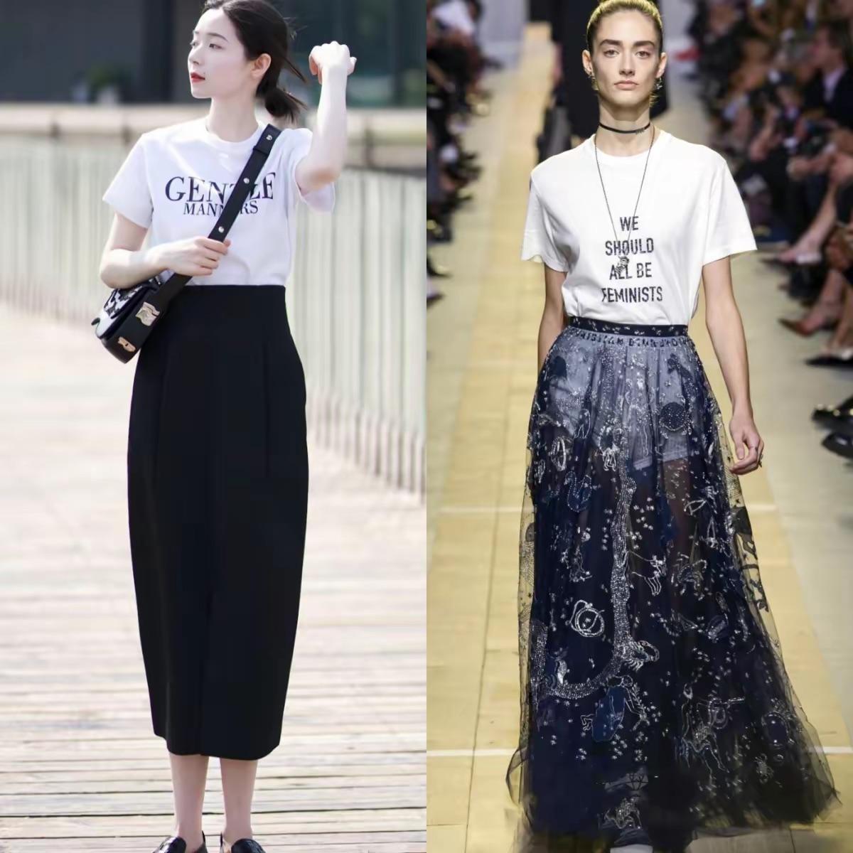 簡單的直筒半身裙,我們可以選擇最經典的黑色系。黑色直筒半身裙,百搭又不挑人。夏天裏隨意的配一件白色字母印花T恤,就給人一種舒適鬆弛的美。