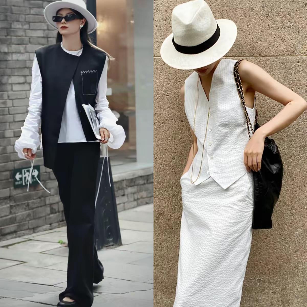 如果你也喜歡西裝馬甲的精緻貴氣,在這個夏天也可以多用西裝馬甲來凹造型。修身一點的西裝馬甲,可以配同款的半身裙。