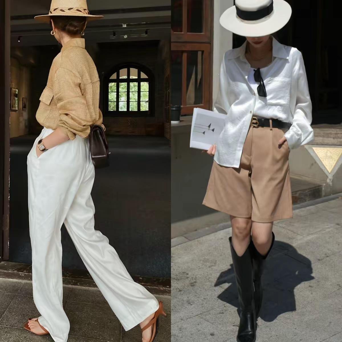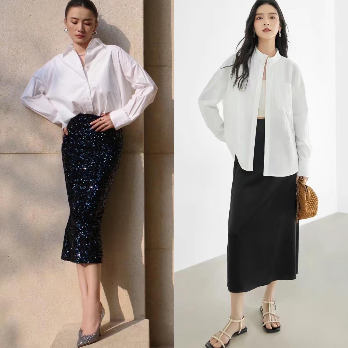 這時候寬鬆白襯衫可以選擇萊賽爾纖維、桑蠶絲、或者真絲的面料,細膩垂順、自帶清涼透氣的觸感。白襯衫搭配白色醋酸半身裙,塞衣角的方式優雅又顯貴。