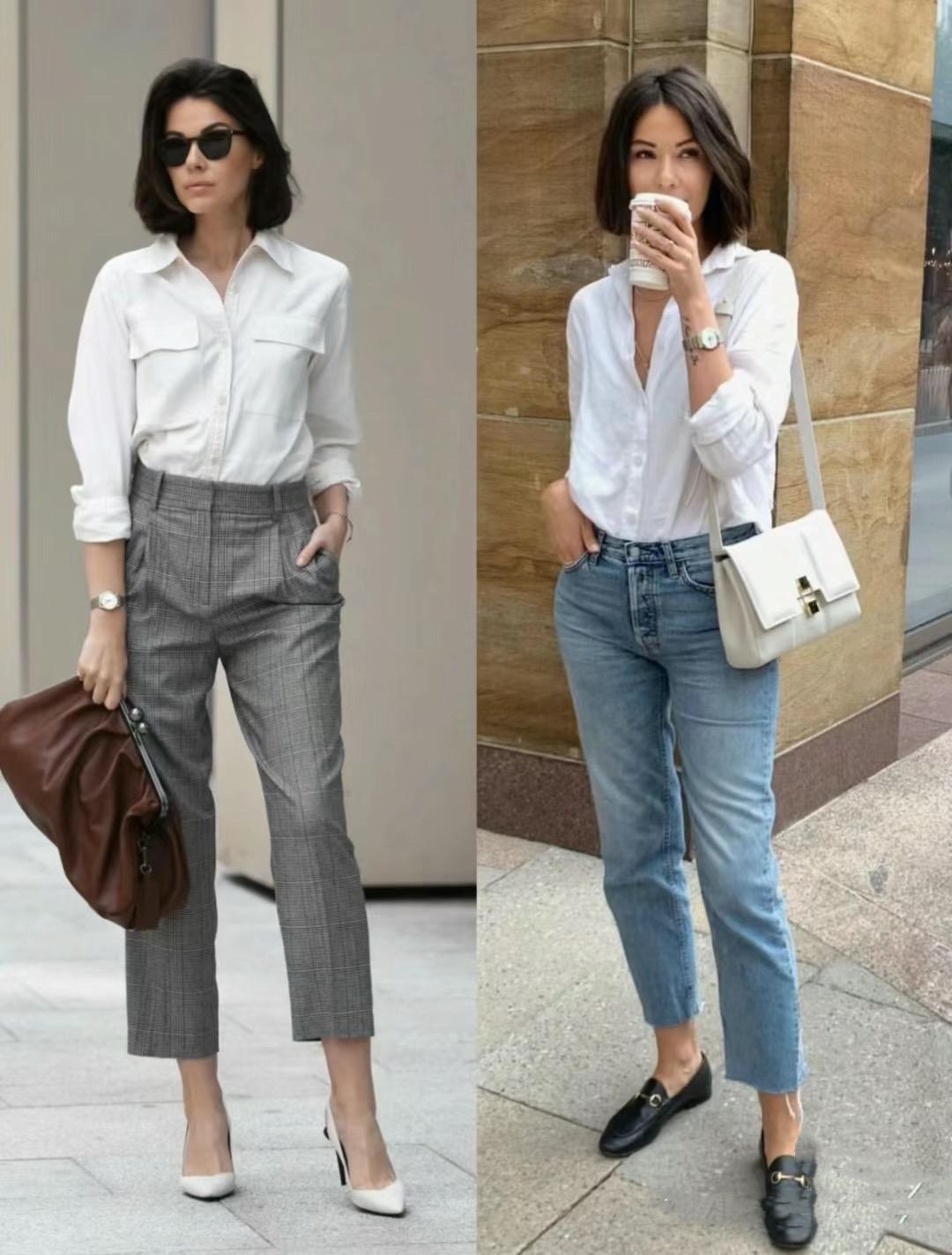 白襯衫可以選擇休閒風、也可以選擇工裝風的設計。以寬鬆白襯衫來搭配高腰褲,可以是西裝褲也可以是牛仔褲。白襯衫配高腰褲,簡約利落、鬆弛又大方。