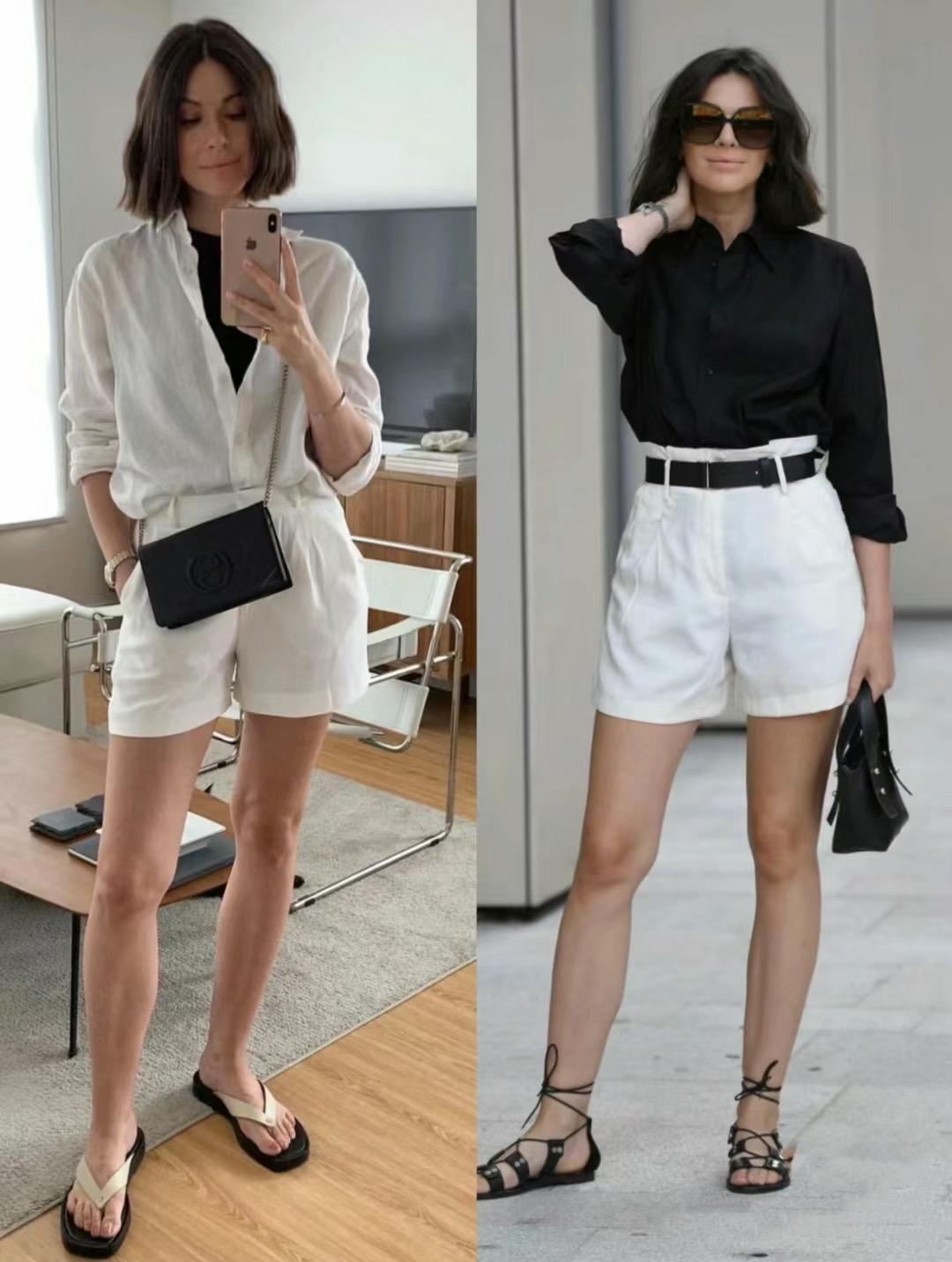 用面料清爽細膩的寬鬆襯衫,來搭配高腰的短褲,這種經典的黑白配也非常高級大氣。想要鬆弛隨性的美,隨意的搭一雙拖鞋、或者平底涼鞋,就可以get時尚氛圍。