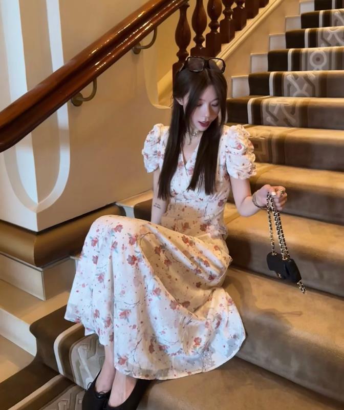 充滿法式風情的一款碎花連衣裙,大氣經典的v領設計,比起圓領更能拉長脖子線條,搭配一雙黑色的奶奶單鞋,既顯得休閒舒適,又超顯溫柔氣質的。