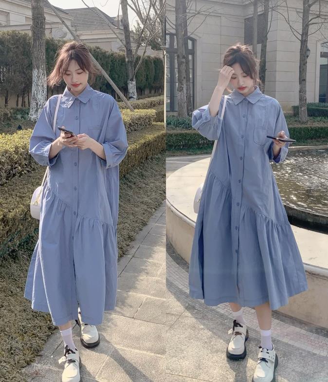 太清新顯瘦的一件襯衫連衣裙了,裙襬呈現出魚尾的形狀,細節感很強,同時也對整個身材進行了修飾。七分落肩袖的設計,很好修飾手臂線條,遮掩起拜拜肉,寬鬆的裙身加持下,藏肉更顯瘦。