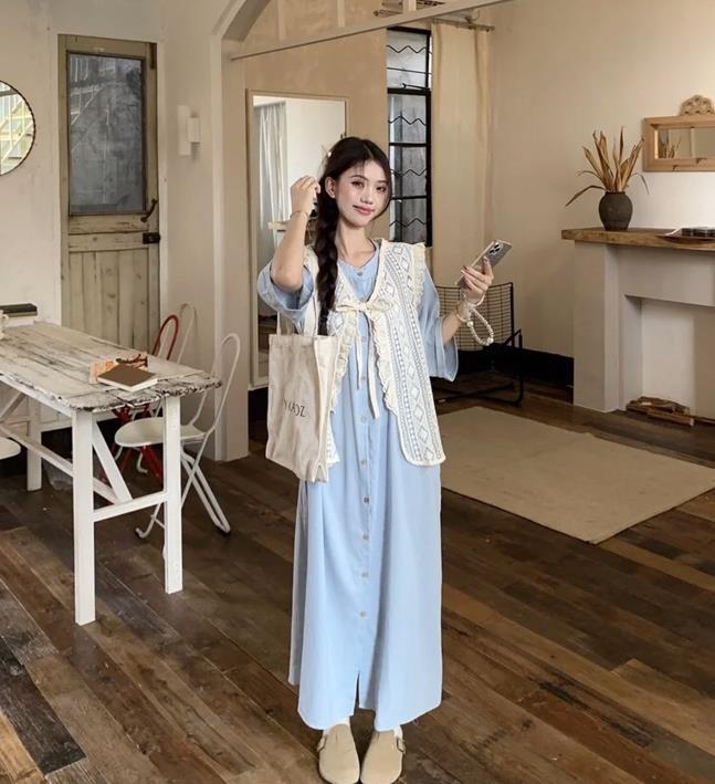 不是高妹子也可以輕鬆駕馭的穿搭,藍色襯衫連衣裙,這個顏色飽和度並不高,穿起來十分襯膚色顯白,寬鬆的直筒版型,輕鬆隱藏起身上的贅肉,也十分顯瘦。疊穿蕾絲馬甲,真的很時尚,也不失層次感。