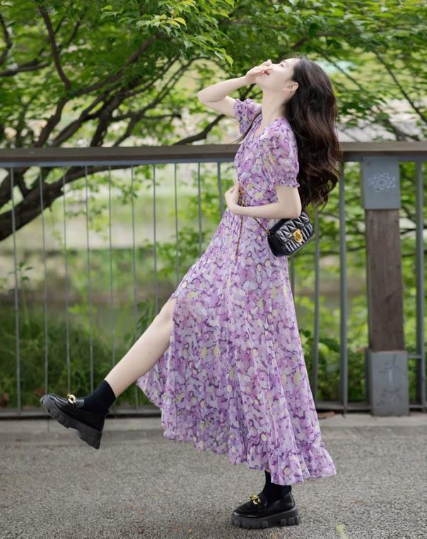 陽光和裙子總是很適合夏天,自帶浪漫氣息的碎花連衣裙,實在是太適合出遊、約會的適合穿了。淺淺的紫色調襯托下,膚色都會顯得很白皙,裙襬開叉的設計,很好將腿部線條拉長。