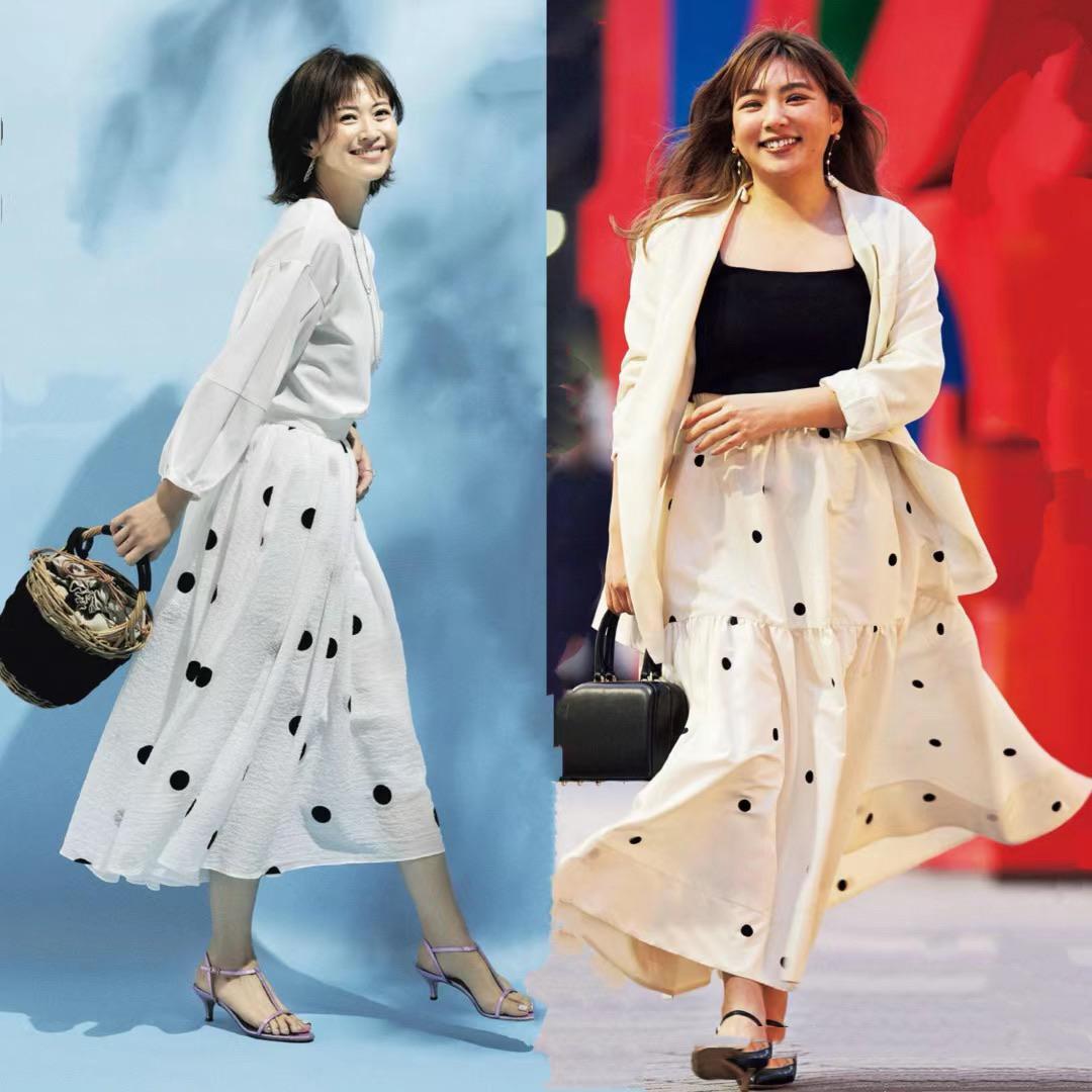 波點半身裙,不要選擇太細密的波點,很容易產生視覺上的疲勞和壓抑。這種白底黑花的波點半身裙,波點元素之間的空隙感比較大,穿起來也格外的輕柔大方。