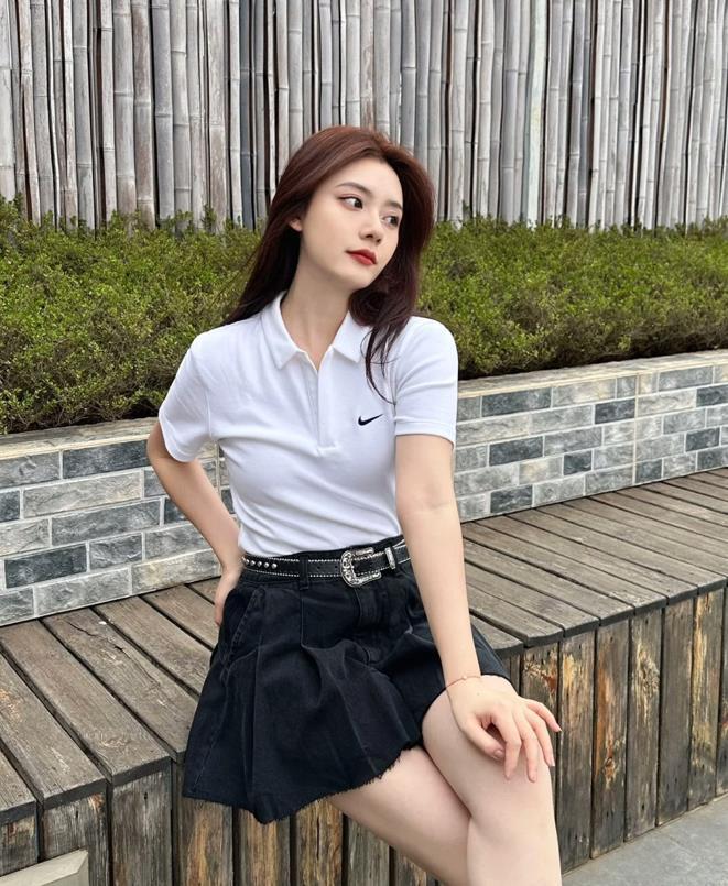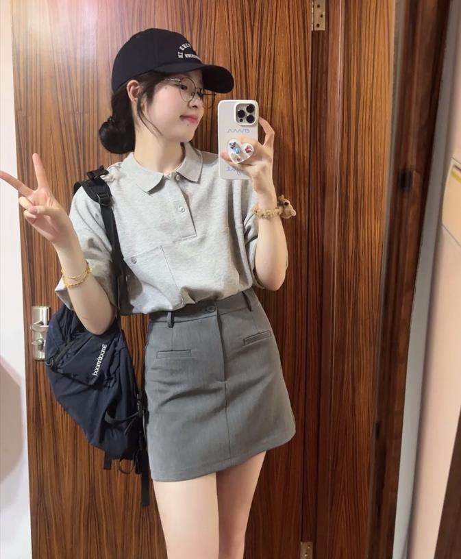 有種韓妹的既視感,一整套的配色都是高級灰的,淺灰與深灰的配色組合,有種很時髦的高級感,也不失層次。短袖polo衫搭配半身短裙,無論是逛街通勤都可以。