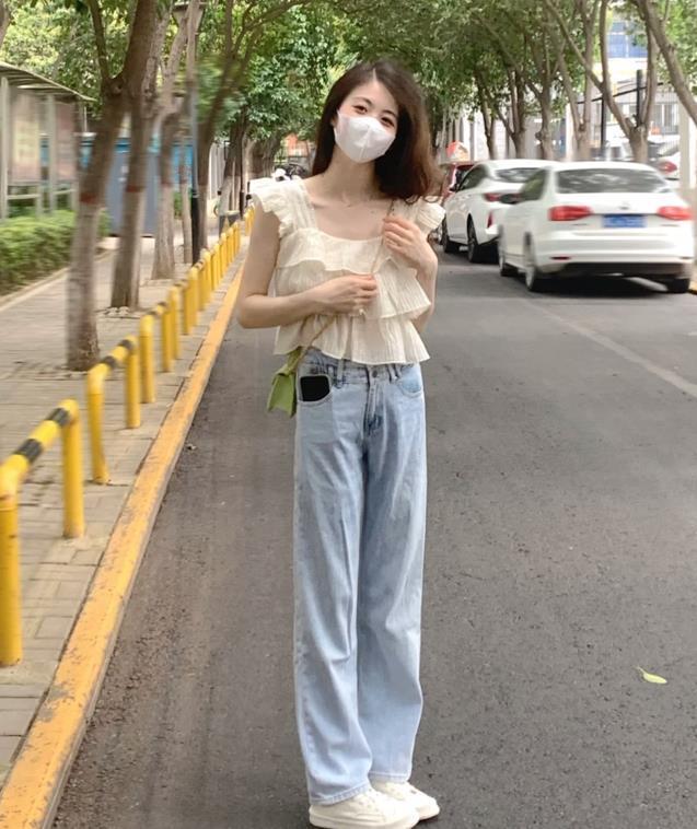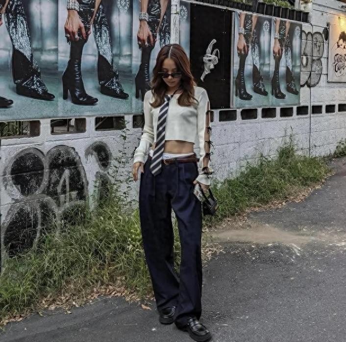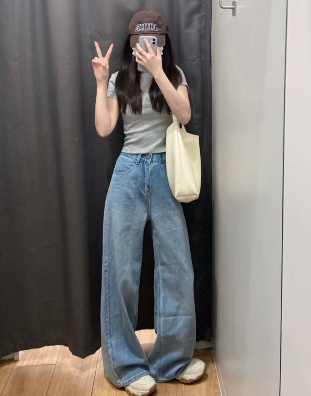 要說今年流行的上衣有什麼,我覺得短款上衣是必不可少的,純色基礎款正肩t恤,這種款式真的很百搭,也不挑人穿。正肩的款式,穿起來能很好修飾上身比例,搭配牛仔闊腿褲,你看,真的太顯腿長了。運動鞋和棒球帽的加入,很好爲整個造型增添青春與活力。