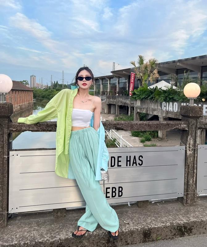 薄荷味的夏天,誰不會喜歡呢?這個馬卡龍的顏色真的太愛了,藍綠撞色設計,實在是太個性了,寬鬆的大版型,不僅可以遮掩起身上的贅肉,還能穿出鬆弛感,內搭一件白色小背心,清爽又幹淨。