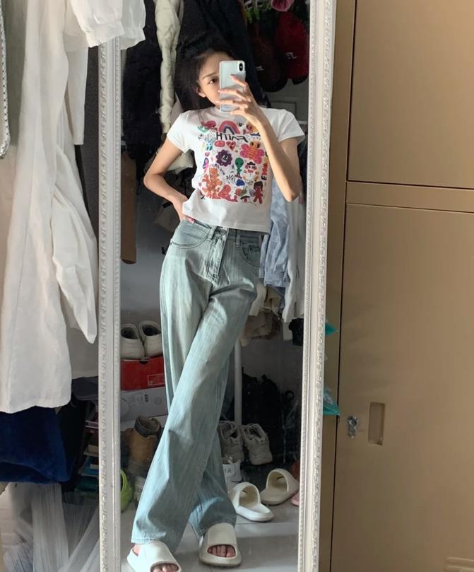 很可愛有趣的短袖印花t恤,利落的短款,上身不僅提高腰線比例,還能巧妙拉長腿部線條。下身搭配的褲子版型,也是超級好的,淺淺的水洗牛仔藍,顏色很適合夏天,一整個清爽乾淨。