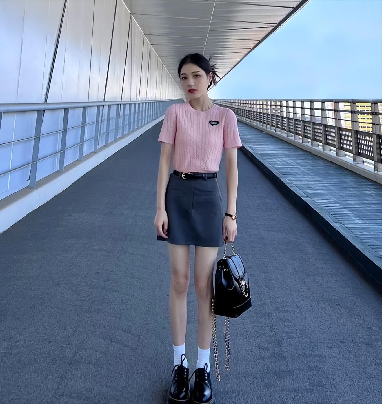 150小個子女生這麼穿真的很顯高挑啊,這一套看起來有種韓國女高的既視感,粉色針織短袖+灰色半身短裙,腰間還增加了一條腰帶點綴,拉長下身比例的同時,又對身材進行了修飾。黑色的厚底鞋和黑色包包顏色一致,讓整個配色看起來更協調了。