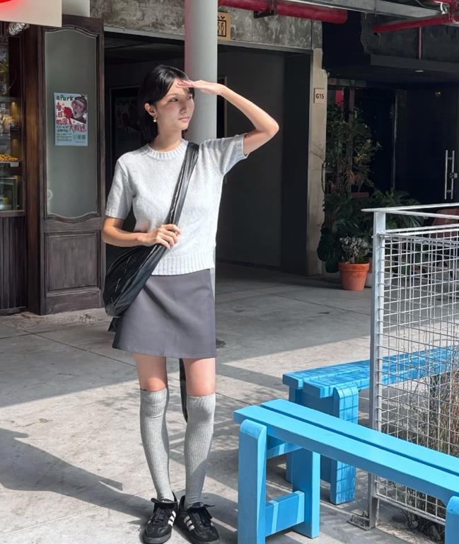 永遠都喜歡低飽和度的灰藍色,炎熱的夏季也能穿的薄款針織短袖,柔軟舒適的面料,貼身穿也不用擔心,寬度適中的版型,可藏肉顯瘦了。選擇灰色半身短裙搭配,一整個顯得很高級。利用灰色中筒襪進行點綴,不僅增加時髦度,還展現出細節感。