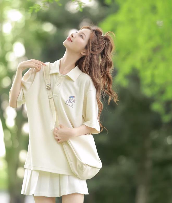 今天這一身穿搭看起來也太治癒了吧?米白色polo衫,顏色就很百搭,也不失溫柔與氣質,寬鬆的版型,穿起來舒適自在更藏肉。搭配同色的百褶短裙,不僅顯得和諧,還非常高級耐看。