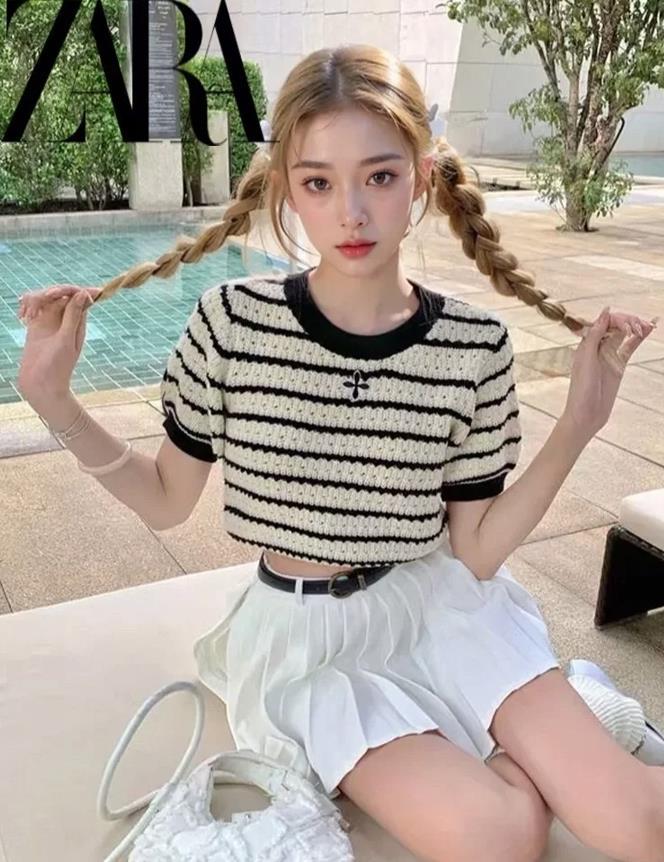 黑白條紋針織短袖,看起來真的超級百搭和顯瘦的,這種面料的舒適度和柔軟度都非常不錯,夏天穿也不會給人悶熱感。選擇一條白色百褶短裙,進行了一簡一繁的組合,輕鬆打造出層次感。