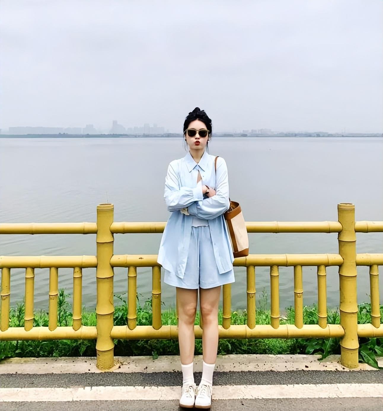 很適合微胖女生的一套穿搭,在夏季,這一身可以直接封神了,不管是襯衫,還是西裝短褲,遮肉顯瘦的效果都是槓槓的。藍色襯衫+白色小背心,這兩種顏色組合一起,也太清爽了,下身配的五分西裝短褲,對於大腿粗的身材也十分友好。