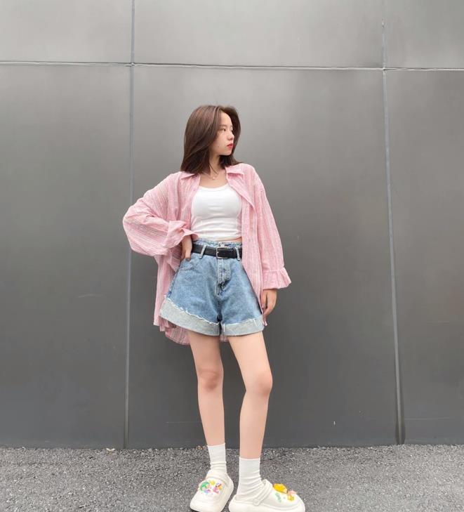 粉色的襯衫穿起來也太顯嫩和減齡了,淺淺淡淡的粉色襯衫,加上寬鬆的版型,不僅把膚色襯托得很白皙,還能讓你穿得十分舒適自在。搭配牛仔短褲,就有種甜酷範了。