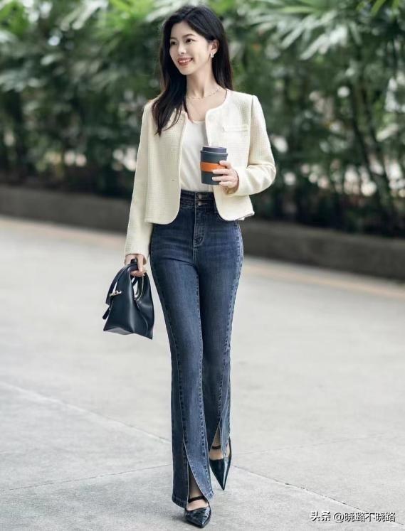 我們想要讓造型的視覺感趨向於簡約大方的風格,那麼就可以在配色上注意數量和飽和度以及明度。選擇基礎色互相搭配所呈現的效果是最爲簡約和自然的,白色的短上衣可以襯膚顯白,又可以化解深色的沉悶感。開叉設計的馬蹄褲結合尖頭鞋的組合,進一步增加造型的修長狀態,也更加優雅大氣。