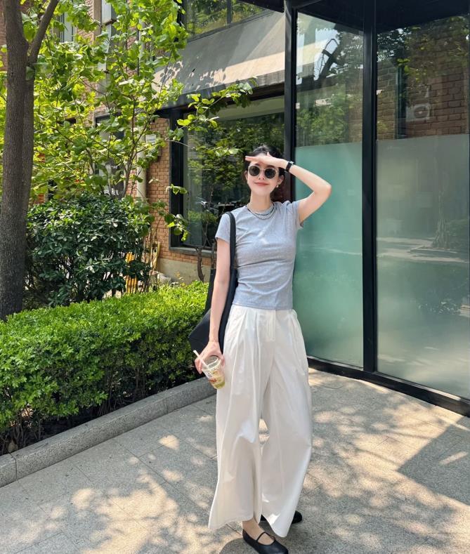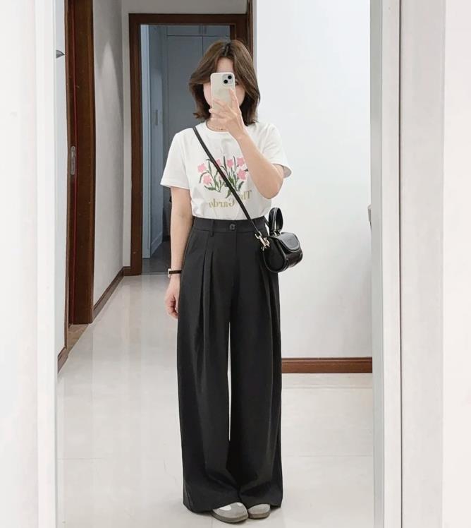 150小個子就很適合這一套,白色正肩短袖t恤,肩型不好看的身材穿起來就可以得到很好的修飾,帶點印花圖案點綴,就更加好看。搭配灰黑色西裝闊腿褲,通勤舒適又好看,記得要把腰線提高起來。
