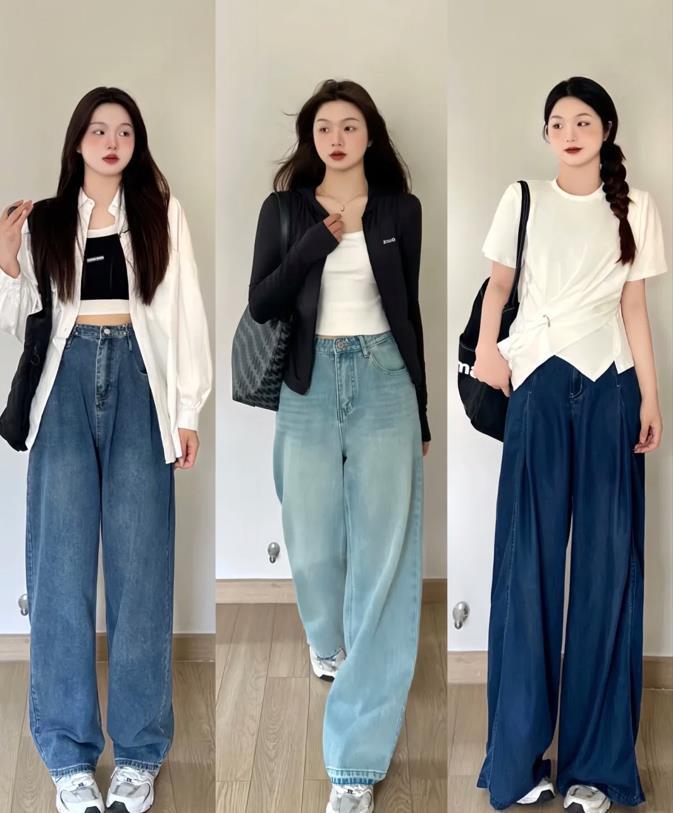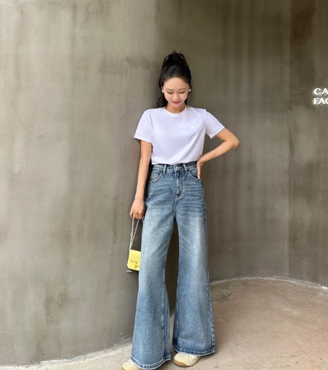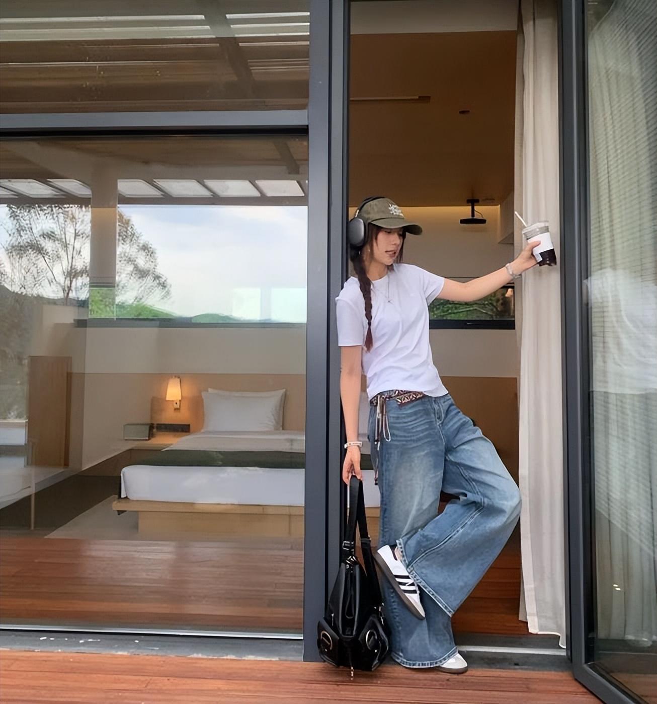 正肩白t穿起來整個身形都很好看,t恤的面料質感極佳的,透氣性好也舒適,夏天穿起來也不用擔心會悶熱,下身搭配的牛仔闊腿褲,對身材包容性真的很好,遮肉又顯腿長,腿型不好的姐妹,閉眼入就行了。