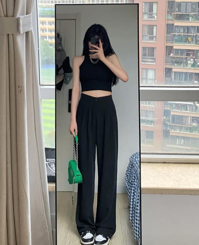 一身黑色系的裝扮,看着就非常顯瘦,露腰短款背心+黑色高腰西裝闊腿褲,一緊一鬆的組合,完美的身材比例就呈現出來了。若是覺得單調,記得要增加一些配飾點綴,佩戴一條項鍊,就很時髦精緻,手裏提着的綠色包包,很好點亮了整個穿搭。