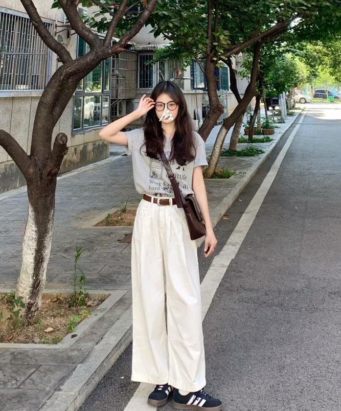 乾淨的白色字母t恤+西裝闊腿褲,這種褲子的版型看起來很不錯啊,寬鬆的闊腿版型,穿起來也太顯瘦了。腰間增加一根腰帶點綴,不僅顯瘦,還能拉長腿部線條,搭配一雙運動鞋,休閒感十足。