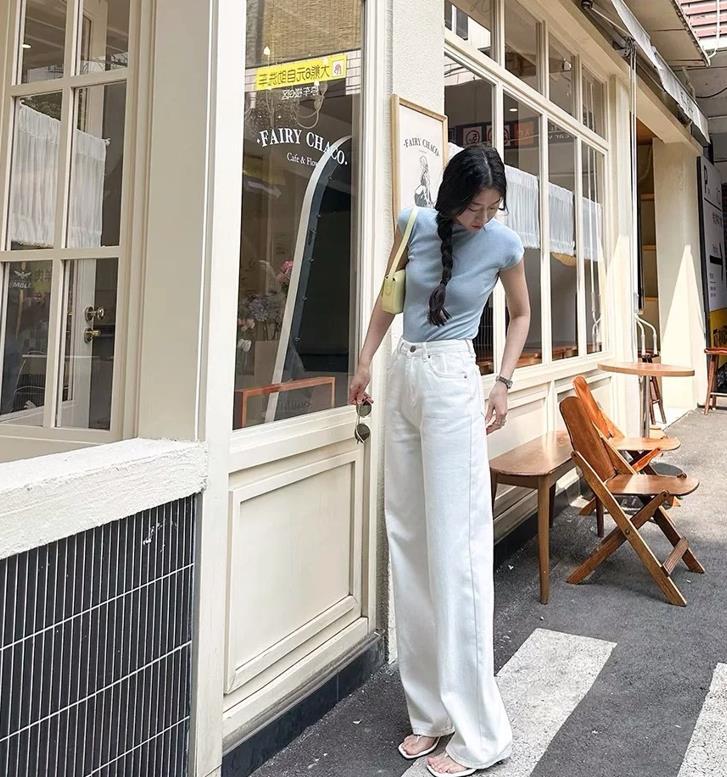 夏天又怎能沒有一條白色闊腿褲呢?這種顏色的褲子,版型一定要選好,這樣穿起來纔不會顯胖。配了淡藍色針織短袖,一緊一鬆的組合,很好優化了整個身材比例,在視覺上看起來就很顯瘦顯高挑,整個配色也非常清新舒服。