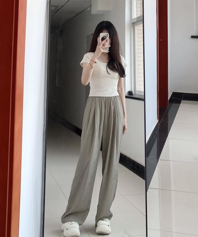 這個夏天,說什麼也不能少了這麼一條冰絲闊腿褲,垂墜感十足的,穿起來也很透氣舒適,最重要的是可以把你的腿部線條拉得很修長。簡單選擇一件t恤來配就行,鞋子可以配運動鞋、涼拖鞋等。