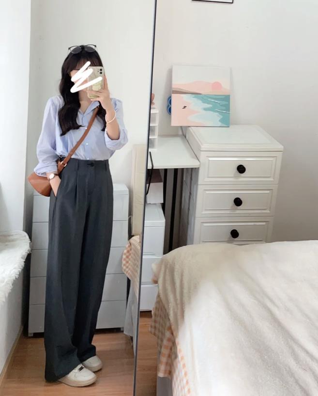 簡單幹淨的一套,灰色西裝闊腿褲,真的建議每個腿型不好看的姐妹都入手一條,選擇淺藍色襯衫相配,藍+灰的配色,怎麼看都很時髦高級。褲子的面料很舒適,垂墜感也極佳,穿起來不僅拉長腿部線條,還顯高挑。