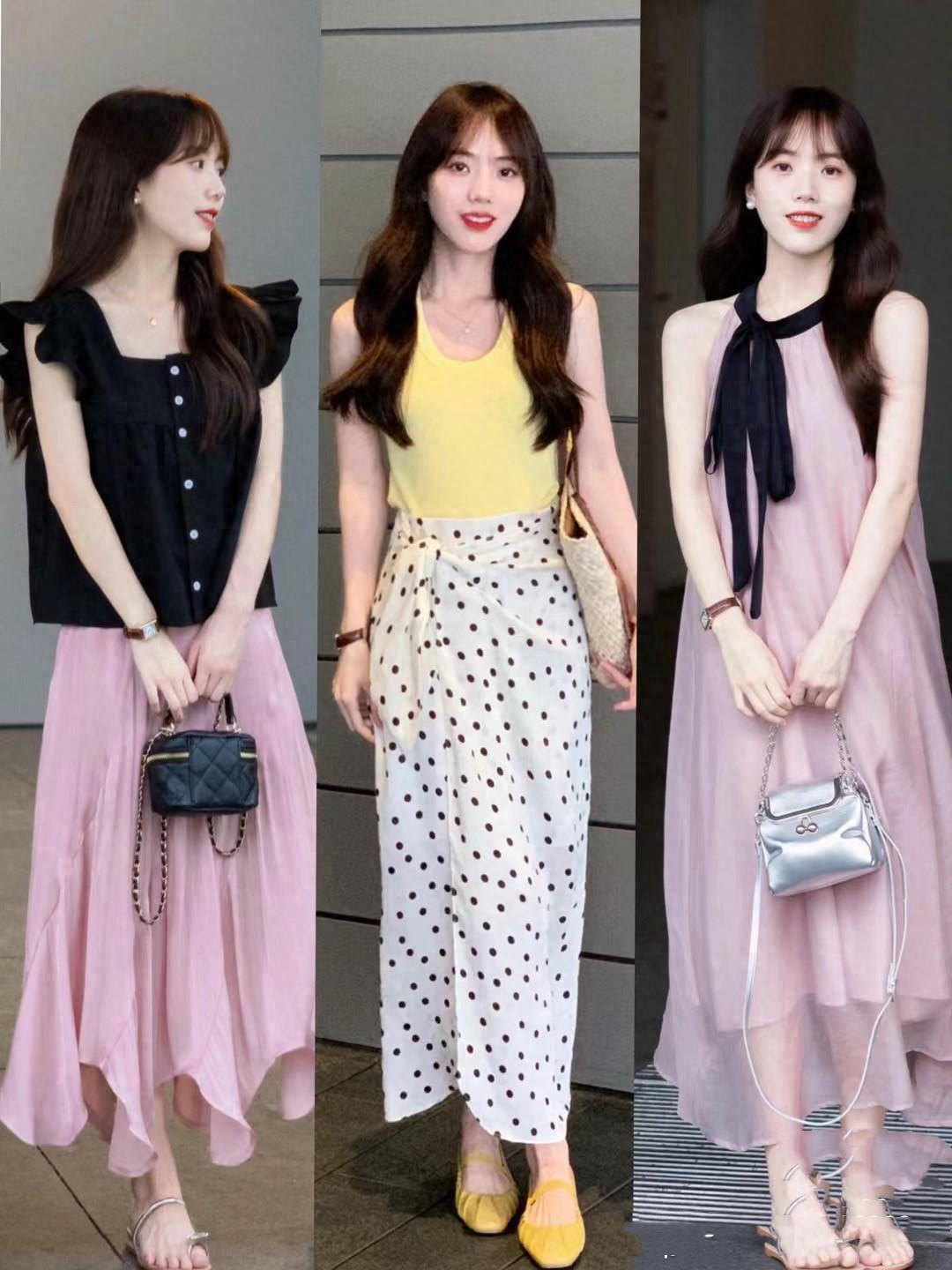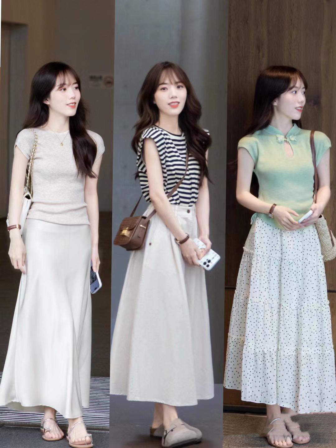 小個子想要更顯高,塑造優越的比例感也相當關鍵。不管是寬鬆的小飛袖上衣、還是修身的吊帶背心,都可以配過膝的半身裙來穿着。